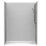 Single-piece barrier-free shower for residential use with a 60″ x 32″ interior, beveled threshold, and left or right drain options.