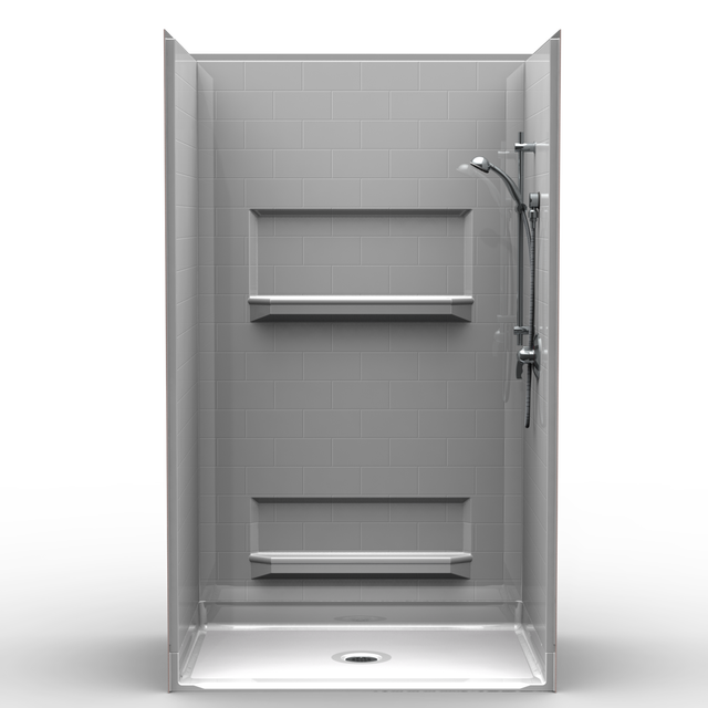 Four-piece 48” x 34” barrier-free shower available in various threshold heights and drain locations. Fiberglass shower with Subway tile look. Luxurious polyester gel coat finish. No mud setting required. All accessories are priced separately.