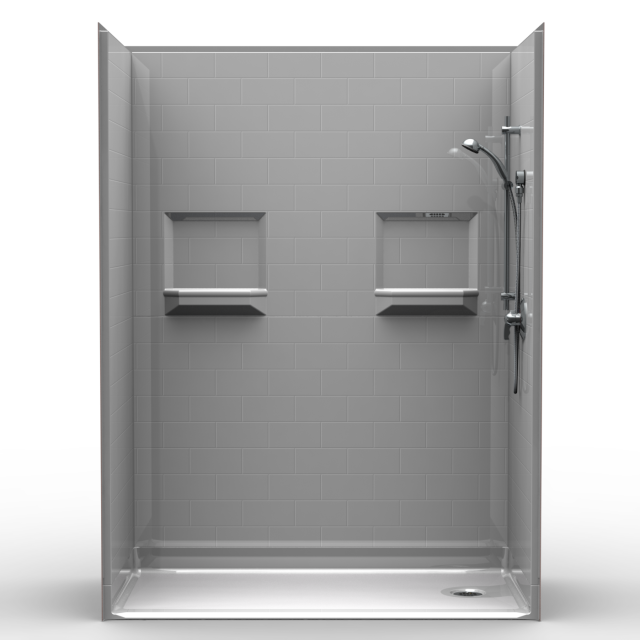 Five piece 60” x 30” barrier free shower available in various threshold heights and drain locations. Fiberglass shower with 4″ x 8″ subway tile look. Luxurious polyester gelcoat finish. No mud setting required. All accessories are priced separately.