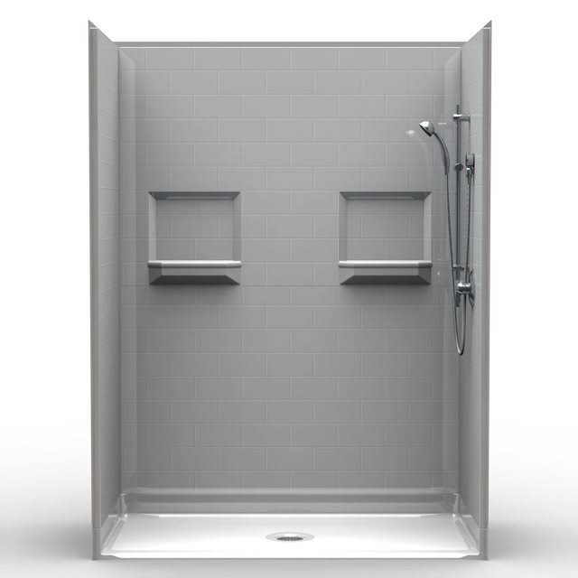 Five piece 60” x 36” barrier free shower available in various threshold heights and drains. Fiberglass shower with 4″ x 8″ subway tile look. Luxurious polyester gelcoat finish. No mud setting required. All accessories are priced separately.
