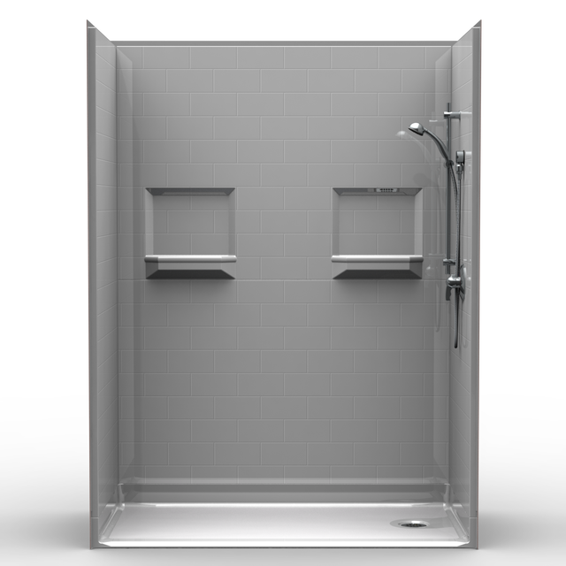 Five-piece 60” x 36” barrier-free shower available in various threshold heights and drains. Fiberglass shower with 4″ x 8″ subway tile look. Luxurious polyester gelcoat finish. No mud setting required. All accessories are priced separately.
