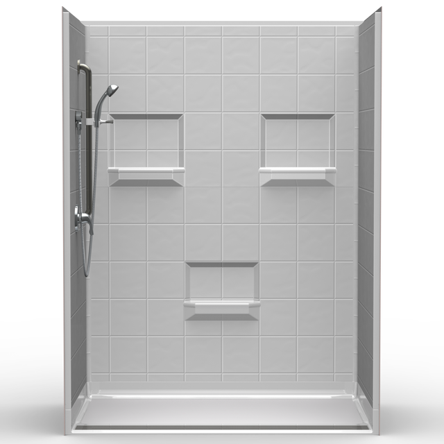 This is a 5-piece barrier-free shower. The model has various threshold heights with a Front Trench drain, beveled threshold, and an eight-inch tile wall pattern finish with built-in soap ledges. All accessories are priced separately.