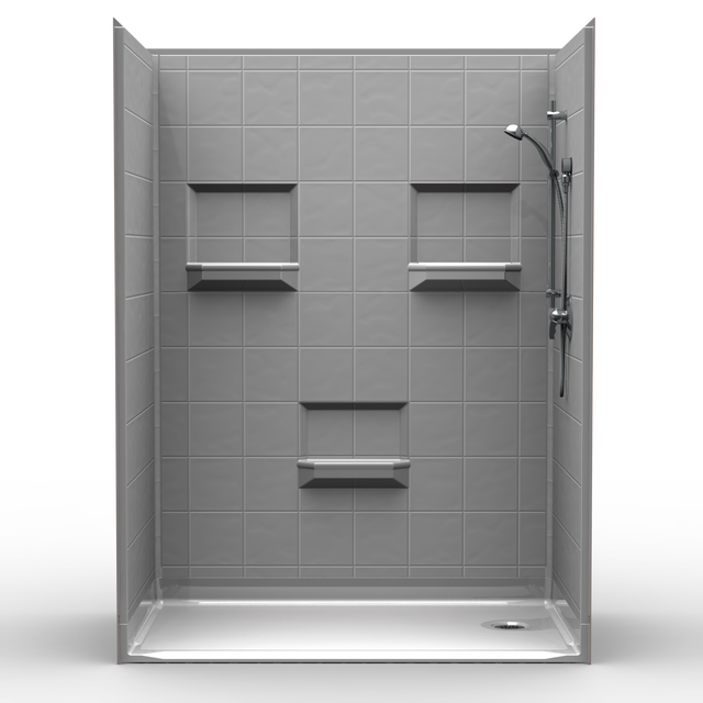 Five-piece 60” x 36” barrier-free shower available in various thresholds and drains. Fiberglass shower with an 8″ Tile look. Luxurious polyester gelcoat finish. No mud setting required. All accessories are priced separately.