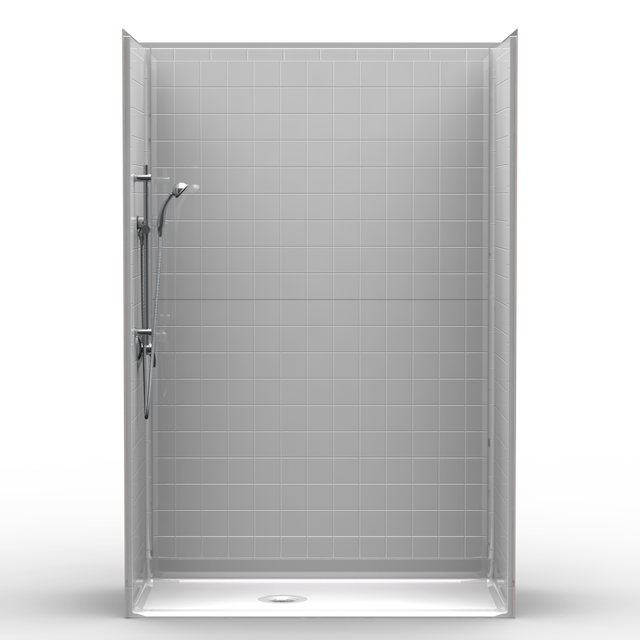 Five piece 60” x 29” barrier free shower available in various beveled threshold heights and drains. Fiberglass shower with 4″ tile look. Luxurious polyester gelcoat finish. No mud setting required. All accessories are priced separately.