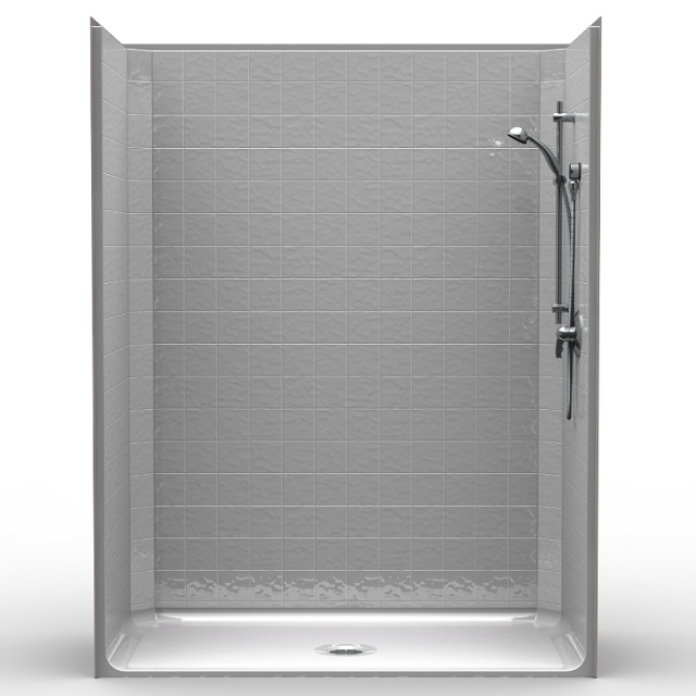 One-piece 60” x 30” barrier-free shower with multiple beveled threshold heights, center drain. Fiberglass shower with 4-inch tile pattern finish. Luxurious polyester gel coat finish. Full plywood backing on all walls for outstanding strength and customized installation of accessories. No mud setting required. All accessories are priced separately.
