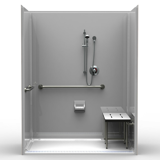 This is a 4-piece Code Compliant shower. The model has various threshold heights with a Front Trench drain and a beautiful Smooth wall pattern finish. Seat and grab bars must be installed in compliance with ADA requirements.