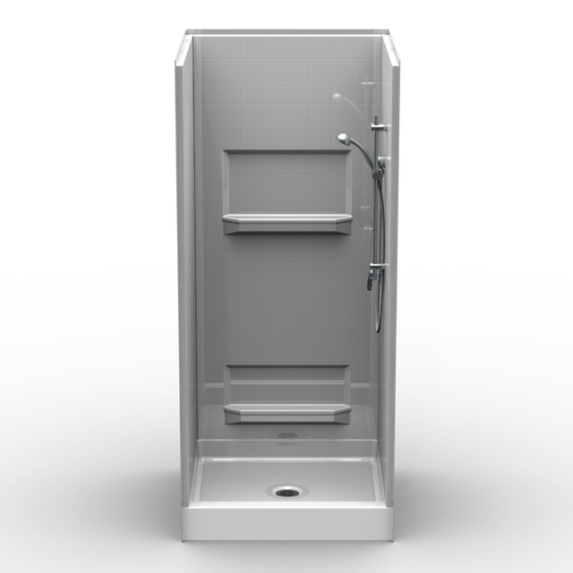 This is a 4-piece curbed shower. The model has a 4″ threshold with a center drain, a beautiful Subway Tile wall pattern finish, and two built-in soap ledges.