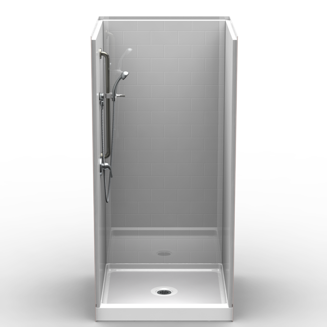 This is a 4-piece Curbed shower. The model has a 4″ threshold with a center drain and a beautiful Subway Tile wall pattern and finish.