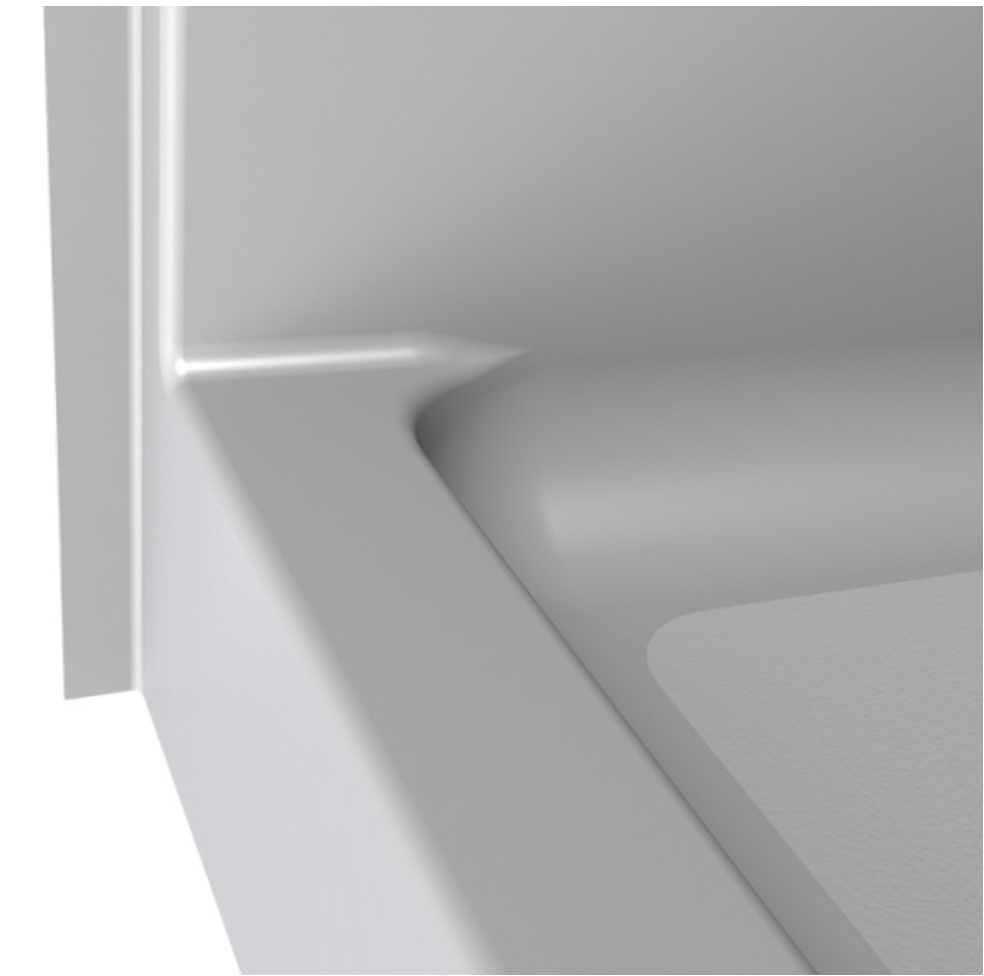 This is a 4-piece curbed shower. The model has a 4″ threshold with a center drain and a beautiful Real Tile wall pattern finish.