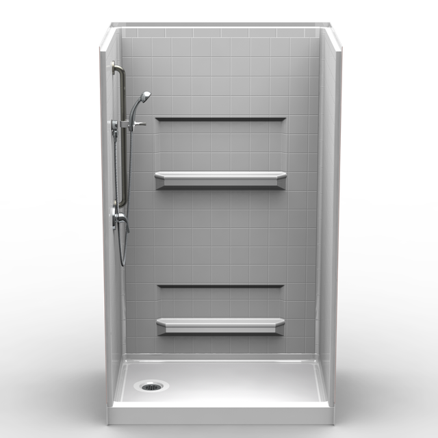 This is a 4-piece curbed shower. The model has a 6.125″ threshold with center, left, or right drain options, a beautiful Real Tile wall pattern finish, and two built-in soap ledges. The AFRs (Above Floor Rough) offer more space underneath to be able to place the drain above the subfloor and direct the piping to the existing drain location. This unique design provides clearance between the pan and flooring so the drainpipe can be routed without the expense of drain relocation.