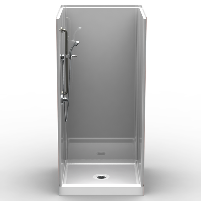This is a 4-piece Curbed shower. The model has a 4″ threshold with a center drain and a beautiful Smooth Wall wall pattern and finish.