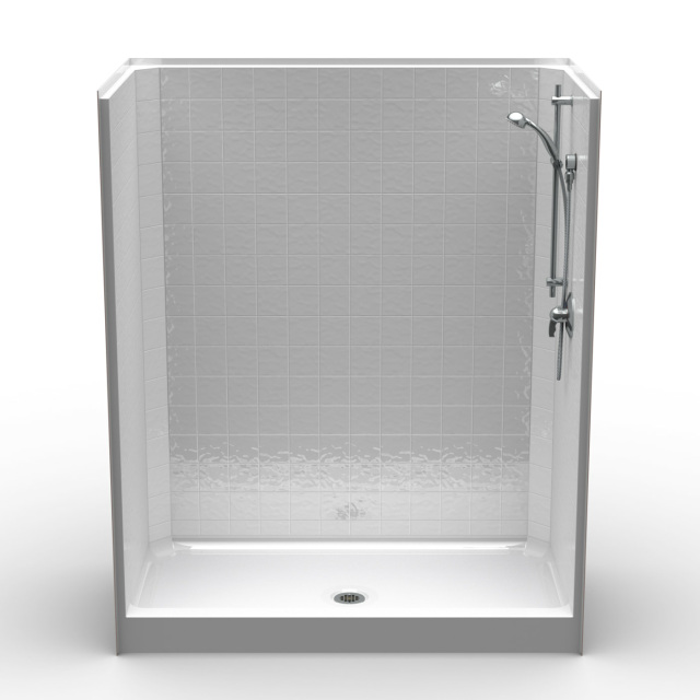 This is a 1-piece Curbed shower. The model has a 5″ threshold with a Center drain and a beautiful Classic Tile wall pattern finish.