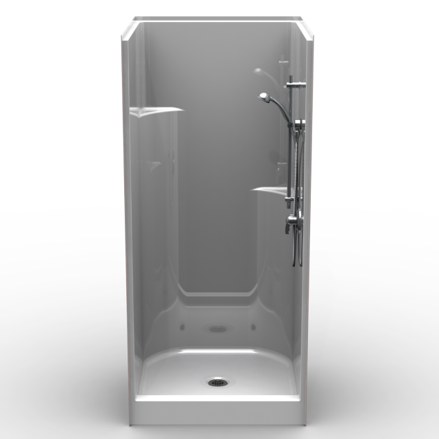 This is a 1-piece Curbed shower. The model has a 5 1/4″ threshold with a Center drain and a beautiful Smooth wall pattern finish.