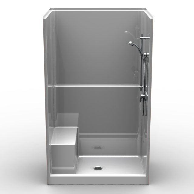 This is a 1-piece Curbed shower. The model has a 4″ threshold with a Center drain and a beautiful Smooth wall pattern finish.